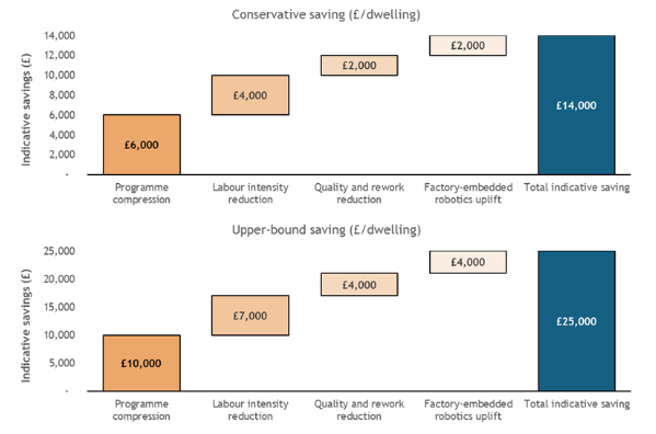 Note: Indicative, programme-level comparison of conservative and upper-bound savings versus a traditional build baseline. Not additive; illustrative only.